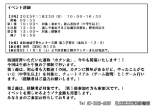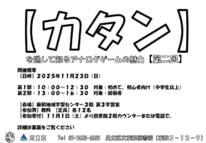 11月232025 東和ボードゲーム俱楽部 東和図書館企画主催 東和ボードゲーム倶楽部 「”カタン”を通して知るアナログゲームの魅力」(第二回) 【開催概要】 【日時】2025年11月23日(日) 第1部:10:00~12:30 対象:初めて、初心者(中学生以上) 小休憩 第2部:13:00~16:30 対象:経験者 【会場】東和地域学習センター3階 第3学習室 【参加費】無料 【定員】各12名 【参加受付】 11月1日(土)より図書館2階カウンターまたは電話で。 【問い合わせ】 足立区立東和図書館 〒120-0003 足立区東和3丁目12番9号 ☎03-3628-6203 注意事項: ※(第1部)中学生以上参加申込可、経験者も可。小学生不可。 ※(第2部)経験者可 (カタン初回の方は不可、第1部参加の方はOK) ※(第2部)小学生も可、但し経験者。 【イベント内容】 日本では数年前よりボードゲーム人気が再燃しています。 海外の図書館では昔から取り扱いがありますが日本の図書館でもボードゲームが楽しめる場所が増えています。 カタンは世界中で愛されているボードゲームです。 東和ボードゲーム俱楽部で遊んでからカタンが好きになった人も多くいます。 まずはこのイベントを通してカタンの魅力と遊び方を知ってもらいたいと思っています。 今回は<第一部>では、初めての方むけにチュートリアル回と1ゲームを行う予定です。 初めての方、初心者さん大歓迎です。経験者の方も参加OKです。 小休憩を挟んで、 <第二部>では、さっとルールを確認した後、2ゲーム行います。 (※今回は時間調整のための他のミニゲーム(ボードゲーム)もご用意します) ご参加希望の方はお早めにお申し込みください。 日にち2025年11月23日 時間10:00~16:30 対象初心者(中学生以上)~経験者 申し込み2025年11月1日(土)より電話または図書館2階カウンターにて受付