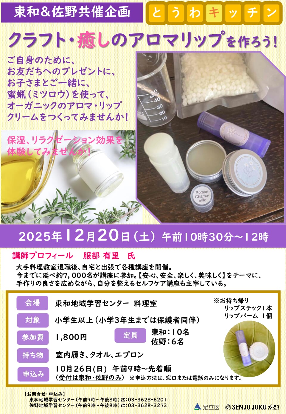 12月202025 東和・佐野共催センター共催企画 癒しのアロマリップを作ろう 🌼🌸🌼🌸🌼🌸🌼🌸🌼🌸🌼🌸 手作りのアロマリップ 🌼🌸🌼🌸🌼🌸🌼🌸🌼🌸🌼🌸 ご自身のために、お友達へのプレゼントに、 蜜蝋(ミツロウ)を使用してオーガニックのアロマリップを作ってみませんか? 💄リップスティック1本 💄リップバーム1個 お持ち帰りできます♪ 日時12月20日(土) 10:30-12:00 講師服部有里 氏 大手料理教室退職後、自宅と出張で各種講座を開催。 今までに延べ約7,000名が講座に参加。【安心、安全、楽しく、美味しく】をテーマに、手作りの良さを広めながら、自分を整えるセルフケア講座も主宰している。 会場料理室 対象小学生以上(小学3年生までは保護者同伴) 参加費1,800円 定員16人(東和10人、佐野6人) 申込み方法電話・受付窓口 申込み・問合せ10月26日(日)9:00-開始 東和地域学習センター ☎03-3628-6201 インターネットからの申し込みはこちらへ→ 講座予約システム https://p-gakushu.jp/adachiku-kouza/ (10月26日以降に受付解禁する講座は、この新しい講座予約サイトでの受付になります。) 備考【持ち物】室内履き、エプロン、手拭きタオル 【キャンセルについて】キャンセルされる場合は、原則開催日の1週間前(12/13)までにご連絡ください。 開催日から6日前~当日のキャンセルされた場合の受講料の返金は致しませんので、予めご了承ください。 ・天候や交通機関の運行状況により、講座が中止・変更になる場合がございます。
