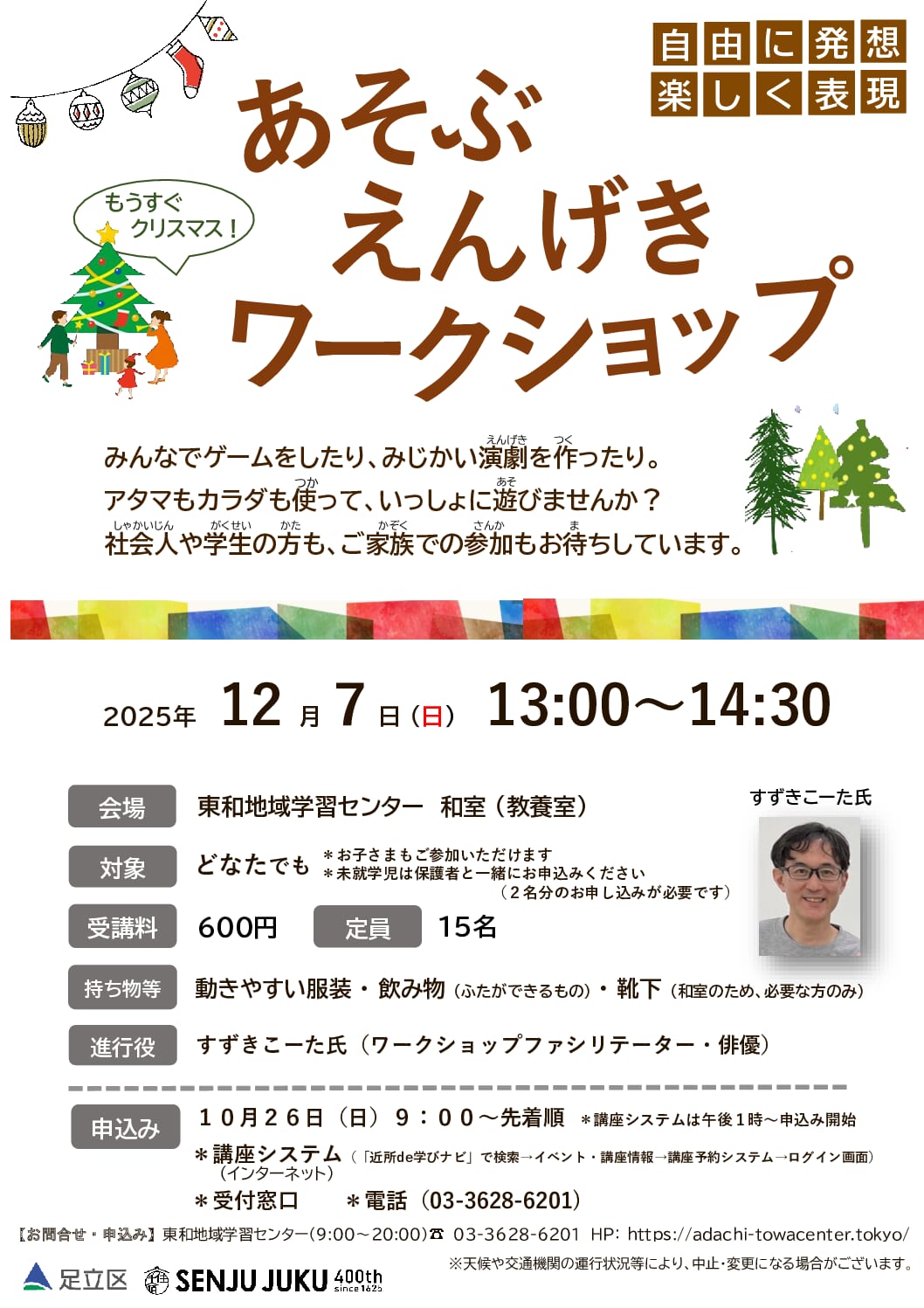 12月072025 あそぶえんげきワークショップ あそぶえんげきワークショップ 🎅🎄✨もうすぐクリスマス🎅🎄✨ みんなでゲームをしたり、みじかい演劇を作ったり。 アタマもカラダも使って、いっしょに遊びませんか? 社会人や学生の方も、ご家族での参加もお待ちしています。 どなたでも大歓迎! 演劇経験のない方も安心してお越しください!! 日時12月7日(日) 13:00-14:30 講師すずきこーた(WSファシリテーター・俳優) 会場和室 対象どなたでも ※お子さまもご参加いただけます。 ※未就学児は保護者と一緒にお申込みください。 (2名分の申込みが必要です) 参加費600円 定員15人 申込み方法インターネット・電話・受付窓口 申込み・問合せ10月26日(日)9:00~開始 ※インターネットは13:00~開始 東和地域学習センター 電話:03-3628-6201 インターネットからの申し込みはこちらへ→ 講座予約システム https://p-gakushu.jp/adachiku-kouza/ (10月26日以降に受付解禁する講座は、この新しい講座予約サイトでの受付になります。) 備考【持ち物】動きやすい服装、飲み物、靴下 【お支払い/キャンセルについて】 ・開催日7日前(11/30)までにお支払いください。 キャンセルされる場合には、主催館まで電話で連絡をお願いします。 開催日7日前(11/30)~当日までのキャンセルの場合は、受講料の返金は致しませんので、予めご了承ください。 ・天候や交通機関の運行状況により、講座が中止・変更になる場合がございます。