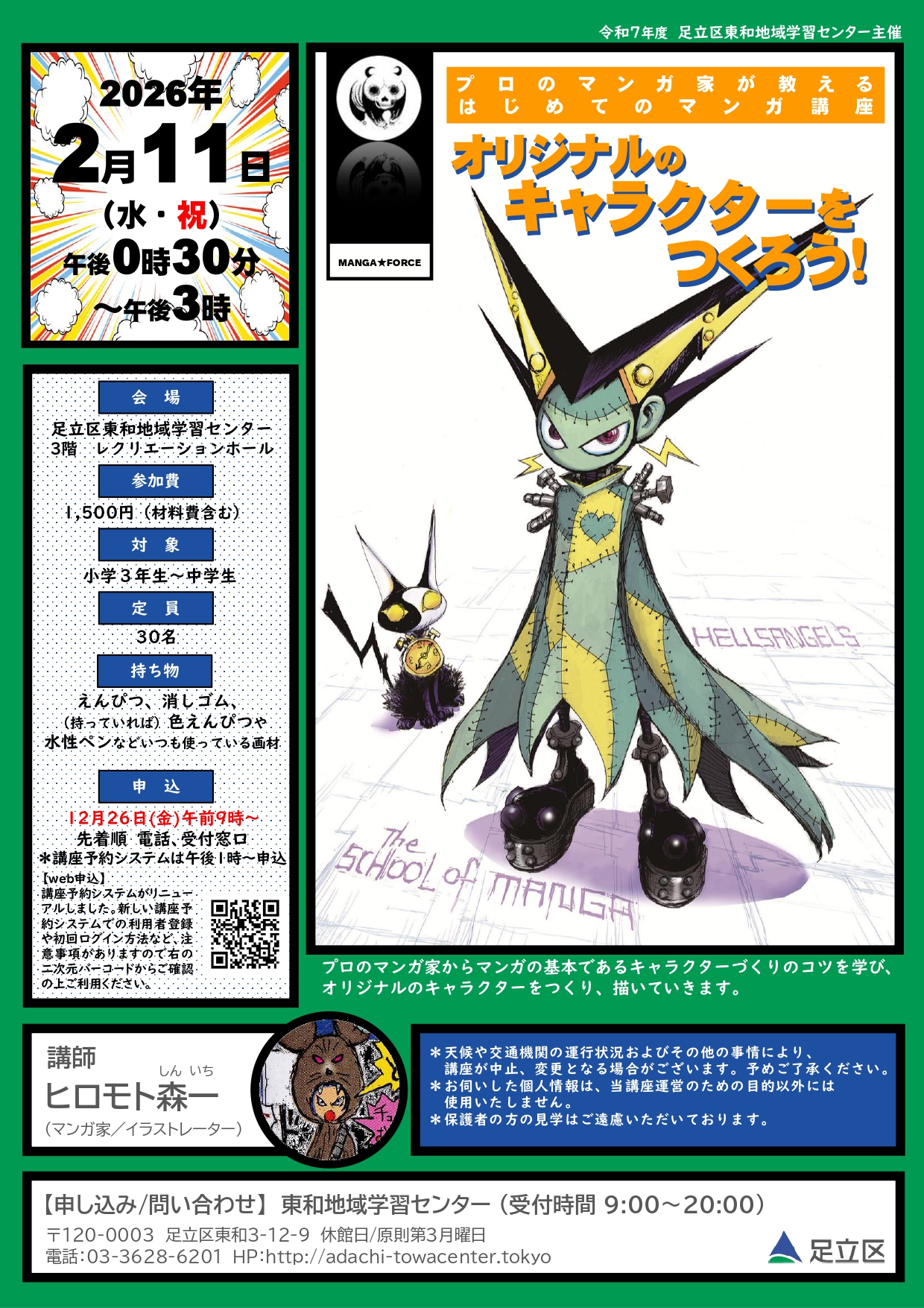 2月112026 はじめてのマンガ講座 オリジナルのキャラクターをつくろう! はじめてのマンガ講座 オリジナルのキャラクターをつくろう! マンガの基本であるキャラクターづくりのコツを学び、 オリジナルのキャラクターをつくり、描いていきます。 日時2月11日(水・祝) 12:30-15:00 講師ヒロモト森一(マンガ家/イラストレーター) 会場北館3階 レクホール 対象小学3年生~中学生 参加費1,500円(材料費込み) 定員30人 申込み方法インターネット・電話・受付窓口 申込み・問合せ12月26日(金)9:00~開始 ※インターネットは13:00~開始 東和地域学習センター 電話:03-3628-6201 インターネットからの申し込みはこちらへ→講座予約システム https://p-gakushu.jp/adachiku-kouza/ 備考【持ち物】鉛筆、消しゴム、色鉛筆や水性ペンなど普段使用している画材 【お支払い/キャンセルについて】 ・開催日7日前までにお支払いください。 キャンセルされる場合には、主催館まで電話で連絡をお願いします。 開催日7日前~当日までのキャンセルの場合は、受講料の返金は致しませんので、予めご了承ください。 ・天候や交通機関の運行状況により、講座が中止・変更になる場合がございます。