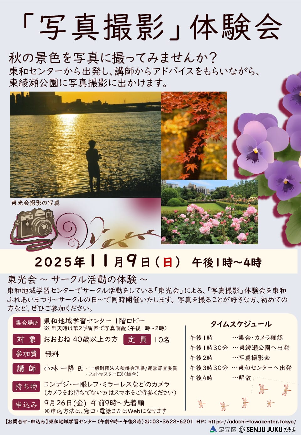 東和地域学習センターでサークル活動をしている「東光会」が、「写真撮影体験」を開催いたします。