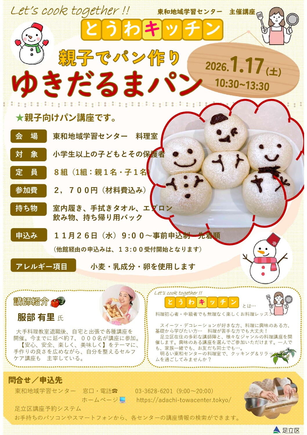 1月172026 とうわキッチン「親子でパン作り ゆきだるまパン⛄」 親子でパン作り! ⛄🍞りんごパン🍞⛄ 手作りを楽しむ、親子向けパン作り講座です。 ふわふわの生地をこねて可愛らしいゆきだるまを作ります。 【アレルギー項目】小麦・乳成分・卵・ とうわキッチンとは・・・ 料理初心者・中級者でも無理なく楽しくお料理レッスン!スイーツ・デコレーションが好きな方、料理に興味のある方、基礎から学びたい方… 料理が苦手な方でも大丈夫!足立区在住の多彩な講師陣と、様々なジャンルの料理講座を開催します。興味のある講座を選んでご参加いただけます。一人でも、家族でも、お友だち同士でも…明るい東和地域学習センターの料理室で、クッキング&リラックスタイムを過ごしてみませんか? 日時2026年1月17日(土) 10:30-13:30 講師服部 有里氏 大手料理教室退職後、自宅と出張で各種講座を開催。今までに延べ約7,000名が講座に参加。 【安心、安全、楽しく、美味しく】をテーマに、手作りの良さを広めながら、自分を整えるセルフケア講座も主宰している。 会場料理室 対象小学生以上 参加費2,700円(材料費込み) 定員8組(親1子1 申込み方法電話・受付窓口 申込み・問合せ11月26日(土)9:00-開始 東和地域学習センター ☎03-3628-6201 備考【持ち物】室内履き、エプロン、手拭きタオル、飲み物 【お支払い/キャンセルについて】開催7日前(1/10)までにお支払いください。キャンセルされる場合には、開催1週間前(1/10)までに主催館まで電話で連絡をお願いします。開催日から6日前~当日のキャンセルされた場合の受講料の返金は致しませんので、予めご了承ください。 ・天候や交通機関の運行状況により、講座が中止・変更になる場合がございます。