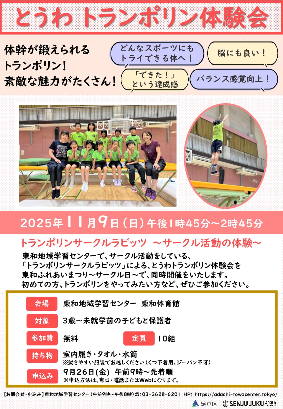 11月092025 とうわトランポリン ~元気に跳ねてみようサークル体験~ とうわトランポリン ~元気に跳ねてみようサークル体験~ 東和地域学習センターでサークル活動をしている「トランポリンサークルラビッツ」が、「トランポリン体験」を開催いたします。 🎵✨元気に跳ねてみようサークル体験✨🎵 日時2025年11月9日(日) 13:45-14:45 講師トランポリンサークルラビッツ 会場東和体育館 対象3歳~就学前の子どもとその保護者 参加費無料 定員10組 申込み方法インターネット・電話・受付窓口 申込み・問合せ9月26日(金)9:00-開始 ※インターネットは13:00-開始 東和地域学習センター ☎03-3628-6201 インターネットからの申し込みはこちらへ→https://www.city.adachi.tokyo.jp/sg-shien/kouzasisutemu.html 備考【持ち物】動きやすい服装、室内履き、タオル、飲み物 【キャンセルについて】キャンセルされる場合は、原則開催日の1週間前(11/2)までにご連絡ください。 ・天候や交通機関の運行状況により、講座が中止・変更になる場合がございます。