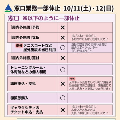 ■各施設窓口の予約システム停止による窓口業務一部休止(10/11・12)