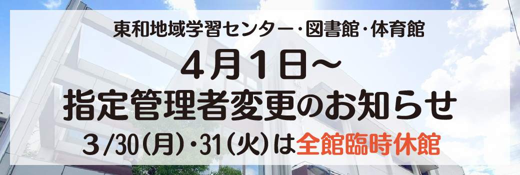 このたび、「東和地域学習センターおよび図書館、体育館」の指定管理者が2026年4月1日より変更となりますので、お知らせいたします。