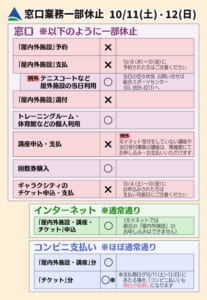 ■各施設窓口の予約システム停止による窓口業務一部休止(10/11・12)