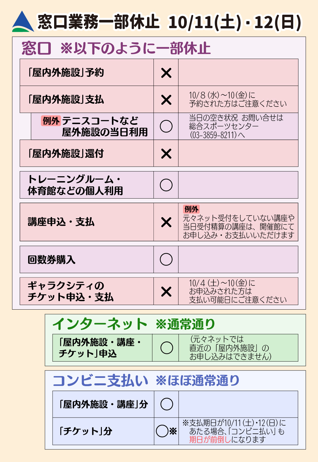3. ■各施設窓口の予約システム停止による窓口業務一部休止(10/11・12)