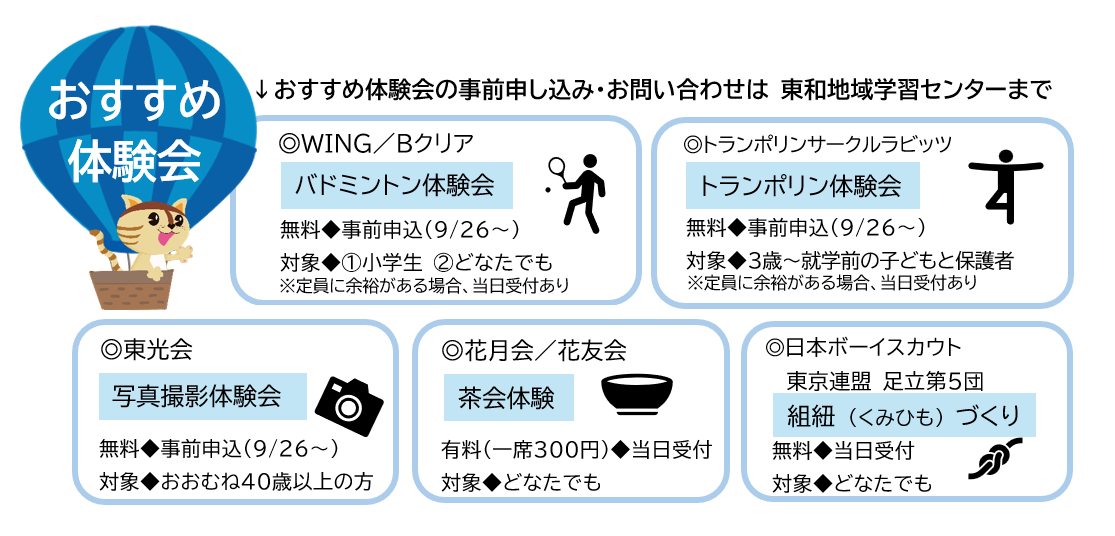 東和センターを拠点に、現在42の登録団体(体育系・文化系サークル)が日々活動しています。